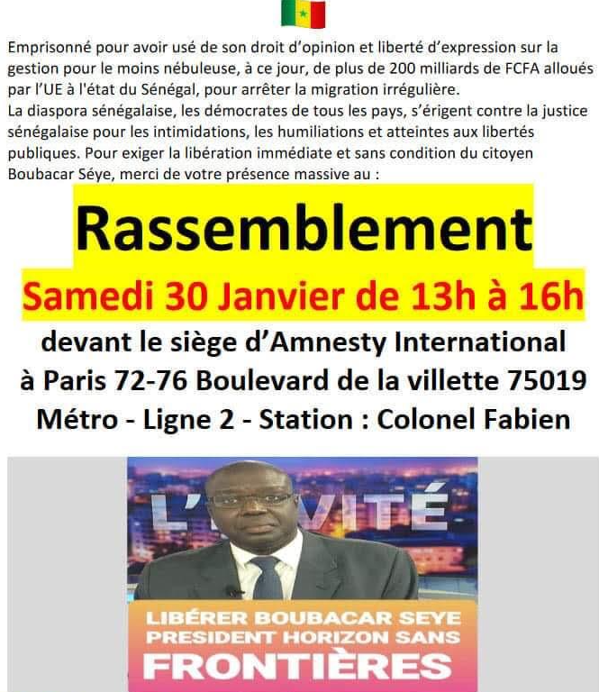 Mobilisons-nous pour arracher Boubacar SEYE, des « griffes » d’un régime liberticide. A Paris, un rassemblement se tiendra le samedi 30 janvier 2021, devant le siège d’Amnesty International, pour exiger sa libération. Nous y serons.