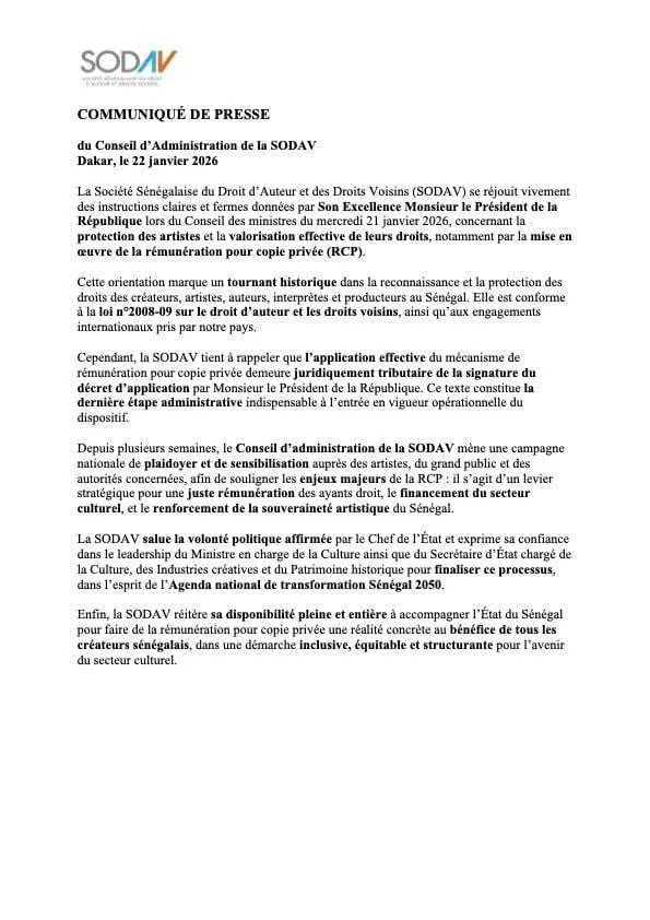 Le Conseil des ministres du 21 janvier 2026 a marqué une étape significative pour le secteur culturel sénégalais, avec une attention particulière portée par le chef de l’État à la situation des créateurs. Si la Société Sénégalaise du Droit d’Auteur et des Droits Voisins (SODAV) accueille favorablement cette volonté politique affichée, elle tient néanmoins à préciser les modalités techniques sans lesquelles ces annonces risquent de rester lettre morte.