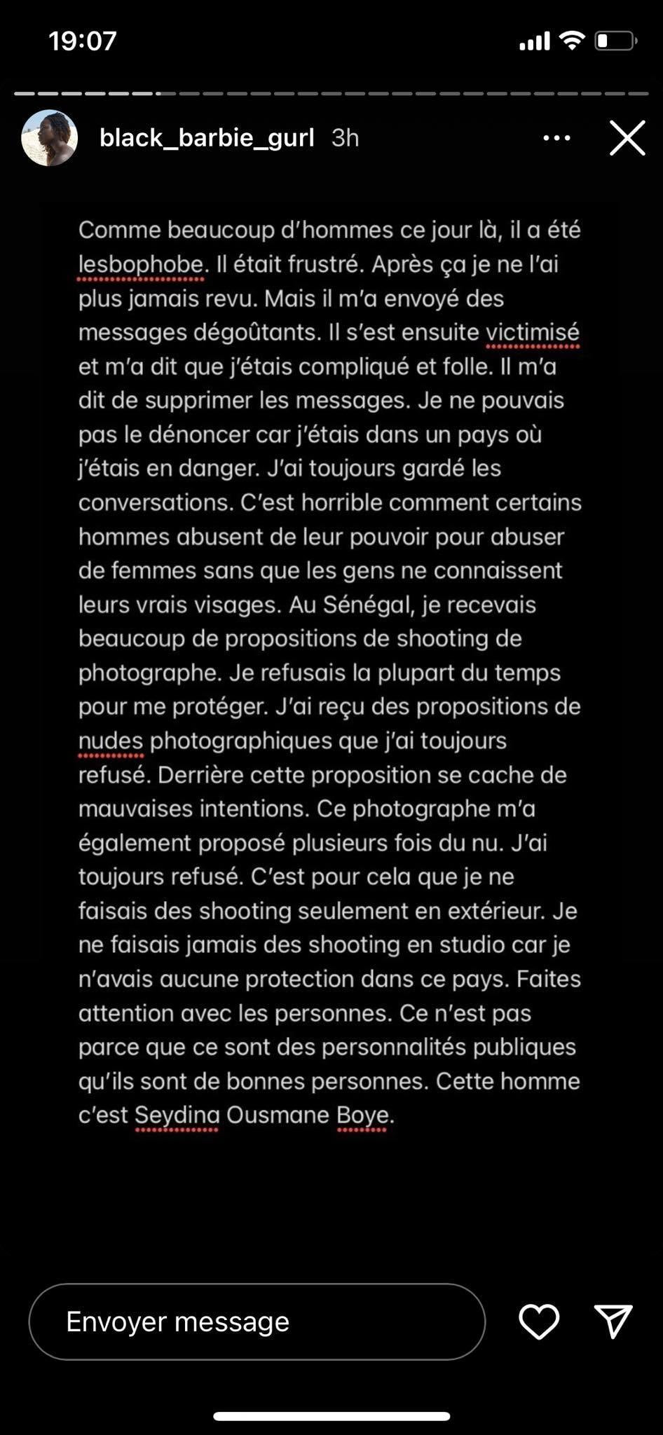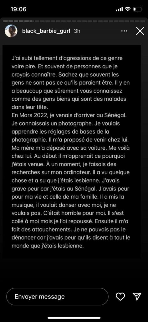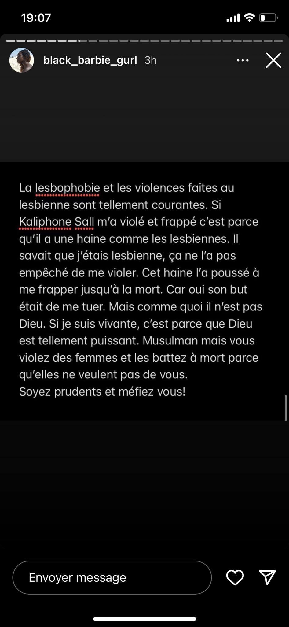 “La lesbophobie et les violences faites aux lesbiennes sont tellement courantes. Si Kaliphone Sall m’a violé et frappé c’est parce qu’il a une haine contre les lesbiennes. Il savait que j’étais lesbienne, ça ne l’a pas empêché de me violer. Cette haine l’a poussé à me frapper, jusqu’à la mort. Car oui son but été de me tuer. Mais comme quoi il n’est pas Dieu. Si je suis vivante, c’est parce que Dieu est tellement puissant. Musulman mais vous violez des femmes et les battez à mort parce qu’elles ne veulent pas de vous”, a-t-elle lâché sur son story Instagram, avant de décrire les violences qu’elle subit de la part des hommes depuis son arrivée au Sénégal.