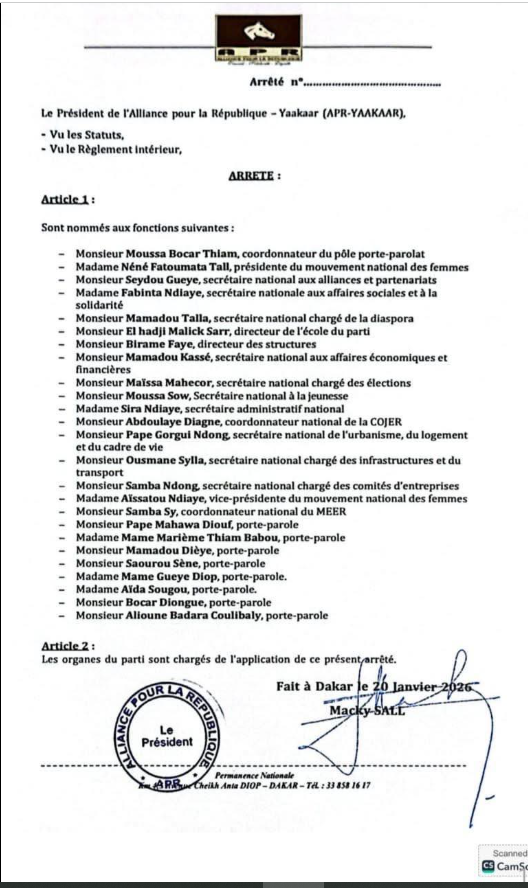 Le président de l’Alliance pour la République – Yaakaar (APR-YAAKAAR), Macky Sall, par ailleurs ancien président de la République et secrétaire général du parti, a signé un arrêté daté du 20 janvier 2026 à Dakar, portant nomination de plusieurs responsables au sein des structures de l’APR.