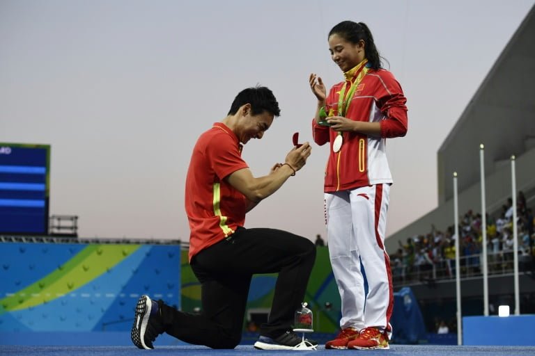 He, deuxième au plongeon de 3 m derrière sa compatriote Shi Tingmao et devant l’Italienne Tania Cagnotto, était encore en train de réaliser son bonheur lorsque Qin Kai, lui même médaillé de bronze chez les messieurs en plongeon synchronisé à 3 m, s’est présenté devant elle avec une bague dans un écrin de velours.