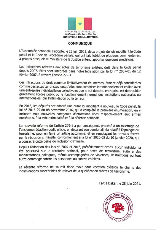 A travers un communiqué, le ministère de la Justice a apporté des précisons sur les Modifications du code pénal et du code de procédure pénale.