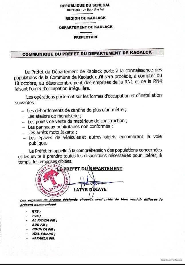 Le préfet du département de Kaolack Latyr Ndiaye a annoncé, samedi 18 2025 ,le lancement prochain d’une vaste opération de désencombrement des entreprises de la RN1 et de la RN2 de la commune de Kaolack. Le préfet a lancé un appel aux occupants afin qu’ils prennent toutes les dispositions nécessaires pour libérer les avant la date fixée.