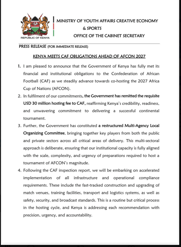 Le gouvernement kényan a annoncé, ce mardi 31 mars, avoir rempli toutes ses obligations financières et institutionnelles auprès de la Confédération africaine de football (CAF), en vue de la co-organisation de la Coupe d’Afrique des Nations 2027.