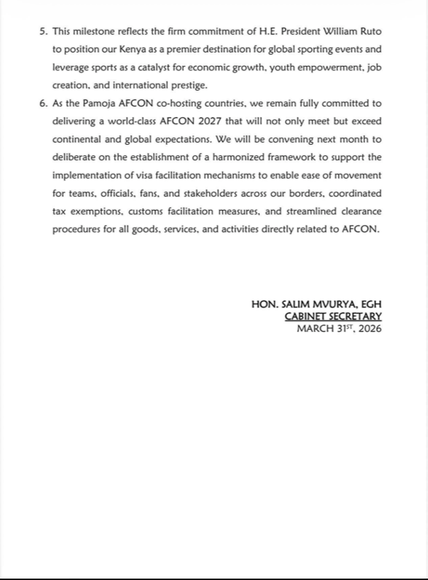Selon Mvurya, ce jalon illustre l’engagement du Président William Ruto à faire du Kenya une destination phare pour les événements sportifs mondiaux, favorisant la croissance économique et l’autonomisation des jeunes.