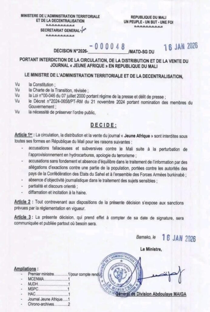 Le gouvernement malien a officiellement interdit la circulation, la distribution et la vente du journal Jeune Afrique sur l’ensemble du territoire national. Le journal est accusé d’avoir : Diffusé des accusations fallacieuses contre le Mali, notamment sur la crise des hydrocarbures.