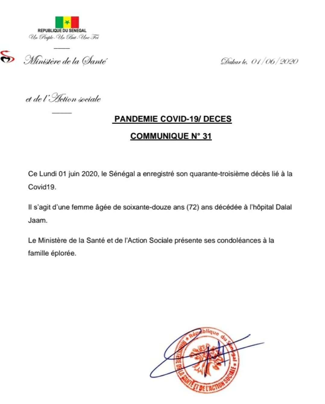 Ce Lundi 01 juin 2020, le Sénégal a enregistré son quarante-troisième décès lié à la Covid19. Il s’agit d’une femme âgée de soixante-douze ans (72) ans décédée à l’hôpital Dalal Jaam.