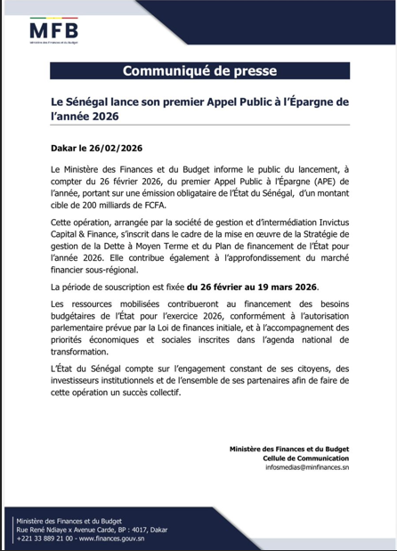 La période de souscription est fixée « du 26 février au 19 mars 2026 », précise le communiqué. Les fonds récoltés serviront à financer les besoins budgétaires de l’État pour l’exercice 2026, conformément à l’autorisation parlementaire prévue par la Loi de finances initiale, tout en accompagnant les priorités économiques et sociales inscrites dans l’agenda national de transformation.