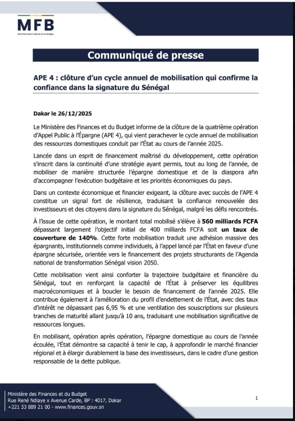 Le Sénégal a bouclé avec succès sa quatrième opération d’Appel Public à l’Épargne (APE 4), clôturant ainsi le cycle annuel de mobilisation des ressources domestiques pour l’année 2025. L’annonce a été faite par le ministère des Finances et du Budget dans un communiqué publié le 26 décembre à Dakar.