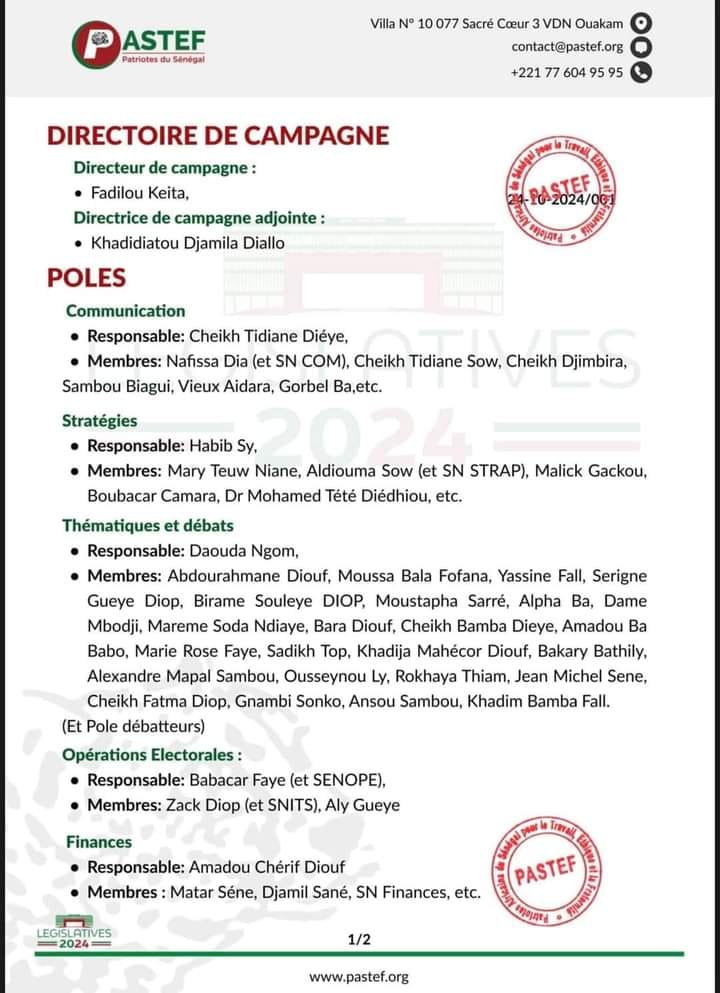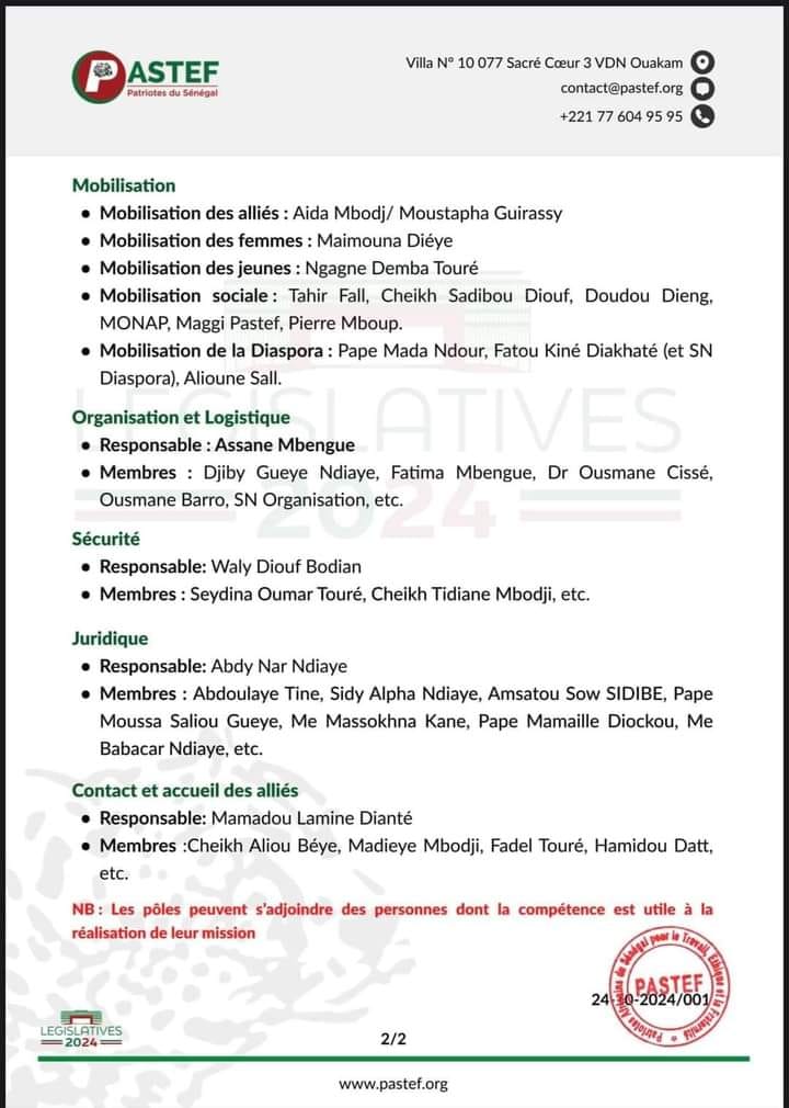 Pour garantir une campagne sans faille, Assane Mbengue dirigera le pôle Organisation et Logistique, tandis que Waly Diouf Bodian est en charge de la Sécurité. Le pôle Juridique, mené par Abdy Nar Ndiaye, gérera les aspects légaux, veillant à ce que le parti respecte toutes les réglementations électorales. Enfin, Mamadou Lamine Dianté supervisera le Contact et accueil des alliés, visant à renforcer les relations avec les partenaires du parti.