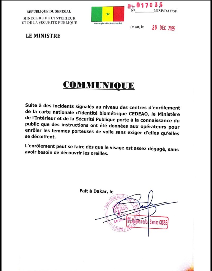 Le Ministère de l’Intérieur et de la Sécurité publique a publié un communiqué à la suite d’incidents signalés dans plusieurs centres d’enrôlement de la carte nationale d’identité biométrique CEDEAO. Ces incidents concernaient les conditions d’enrôlement des femmes porteuses de voile, notamment les exigences liées à la découverte de certaines parties du visage.