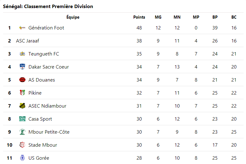 La 24e journée de la ligue 1 Sénégalaise s’est achevée ce dimanche. Génération Foot reste invaincue après 24 matchs. Jaraaf tient jalousement à sa place de dauphine, Teunguedj Fc malgré sa défaite ferme la marche du Podium. L’As Douanes reste la meilleure équipe sur cette fin de saison.