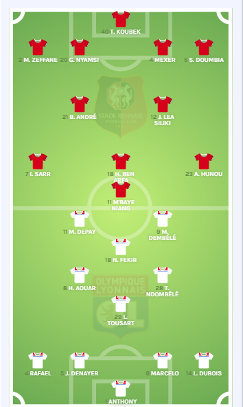 Pour cette rencontre contre Lyon, Julien Stéphan opte toujours pour un 4-2-3-1. Nyamsi est présent en défense central, tout comme Doumbia côté gauche. Sur le plan offensif, Ismaila Sarr et Mbaye Niang, ont été choisis en compagnie de Hunou, qui a été préféré à Grenier.