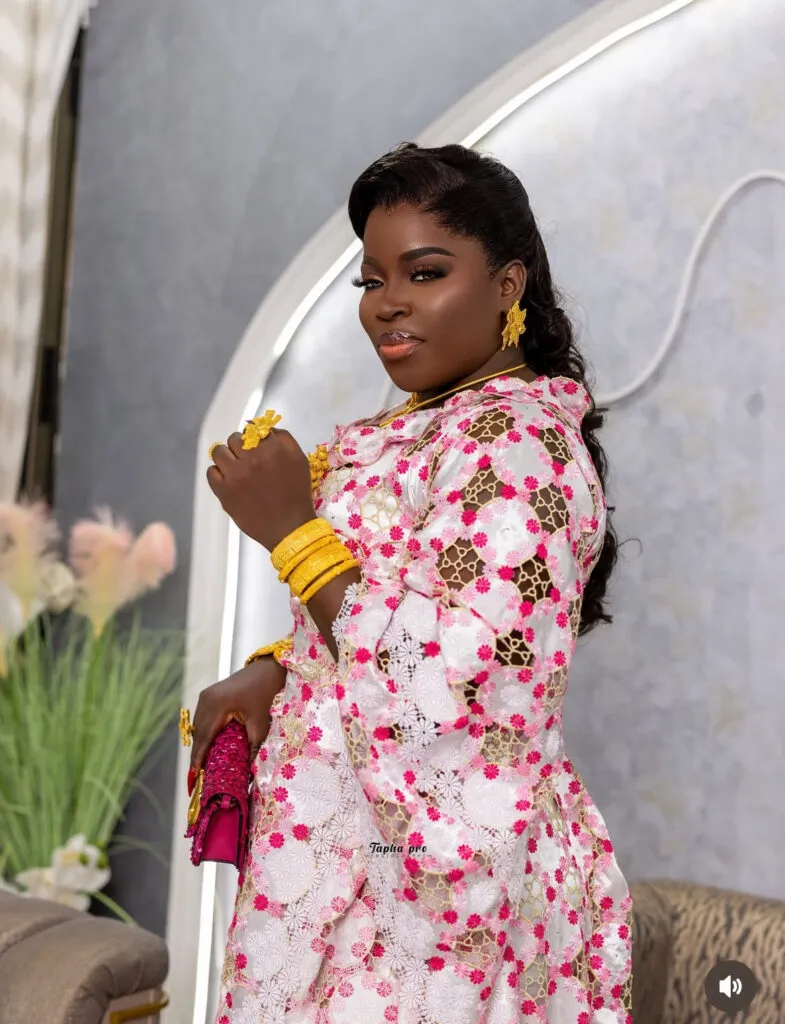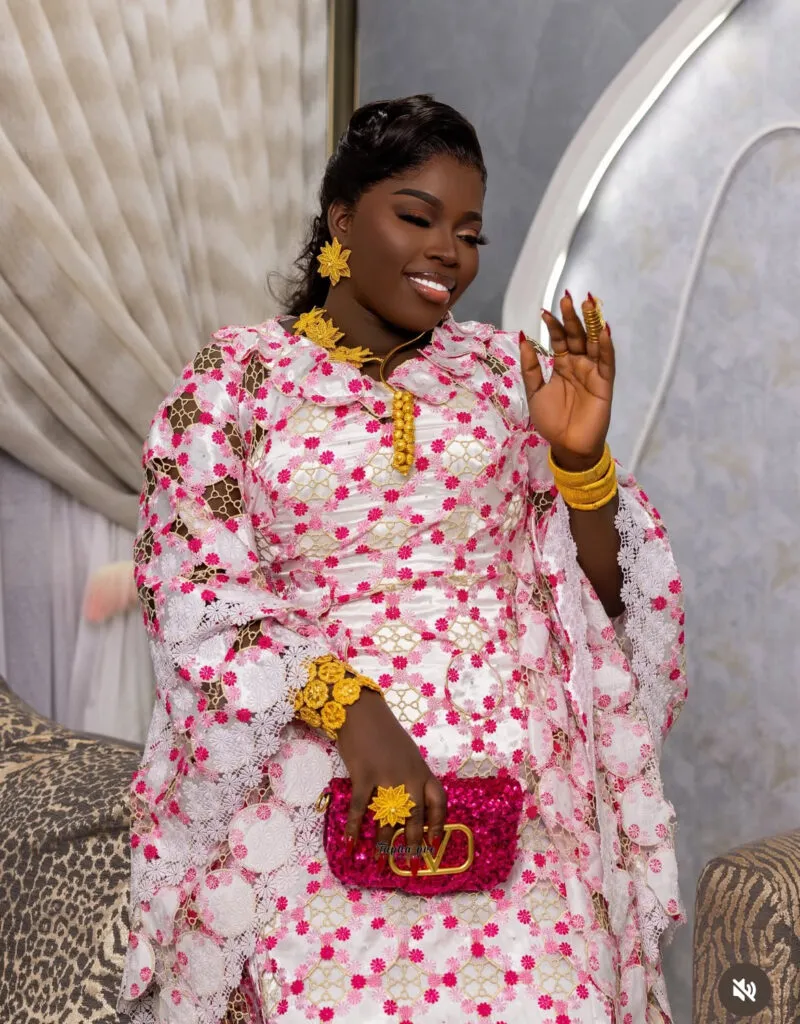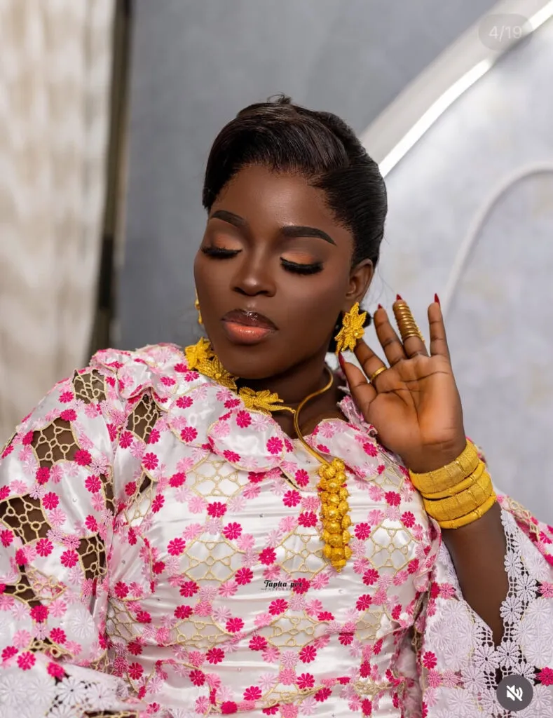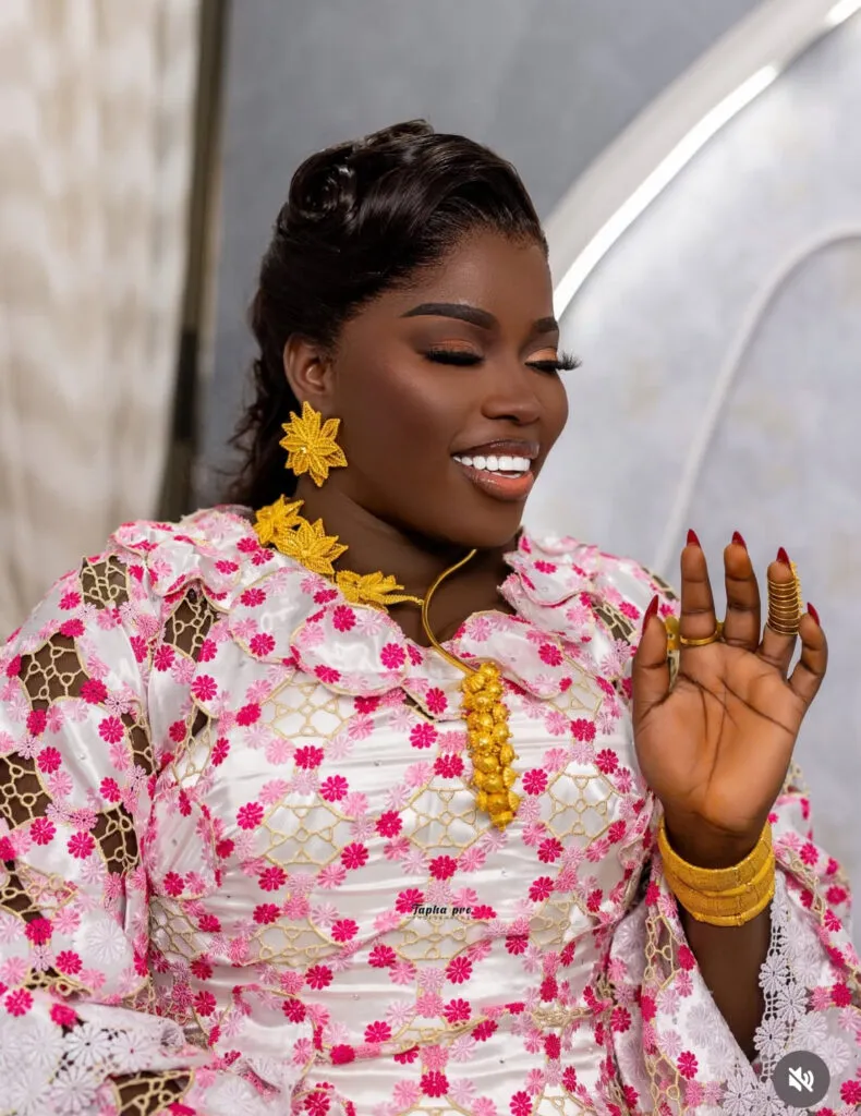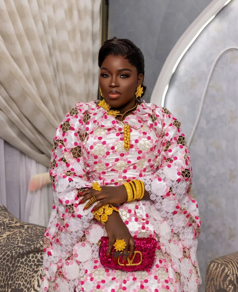 Il s’agit de l’influenceuse Maman Vulgaire. Selon les éléments publiés par Kawtef, elle a fait le choix d’une tenue profondément ancrée dans la culture sénégalaise, tout en y intégrant des codes contemporains.