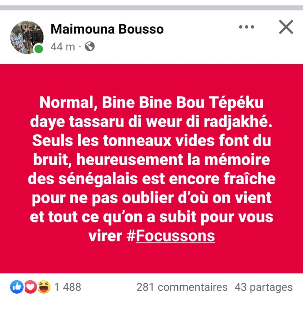 Maimouna Bousso a vivement critiqué le journaliste Cheikh Yerim Seck via sa page Facebook. Elle a répliqué à une déclaration de ce dernier sur SenTv où il aurait qualifié les membres de Pastef de « plus grands manipulateurs de l’histoire politique du Sénégal ». En réponse, Bousso a utilisé l’expression « Seuls les tonneaux vides font du bruit », suggérant que ceux qui parlent le plus fort ont souvent le moins à dire.