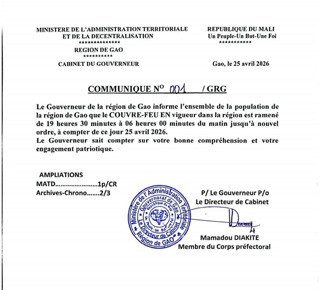 Le gouverneur de la région de Gao informe de l’instauration d’un couvre-feu à compter de ce samedi et jusqu’à nouvel ordre. Depuis juin 2025, plusieurs autorités régionales au Mali ont instauré des couvre-feux dans diverses zones, notamment à Ségou, Sikasso, Nioro, Diéma, Sandaré et Tombouctou, en réponse à une recrudescence des attaques terroristes