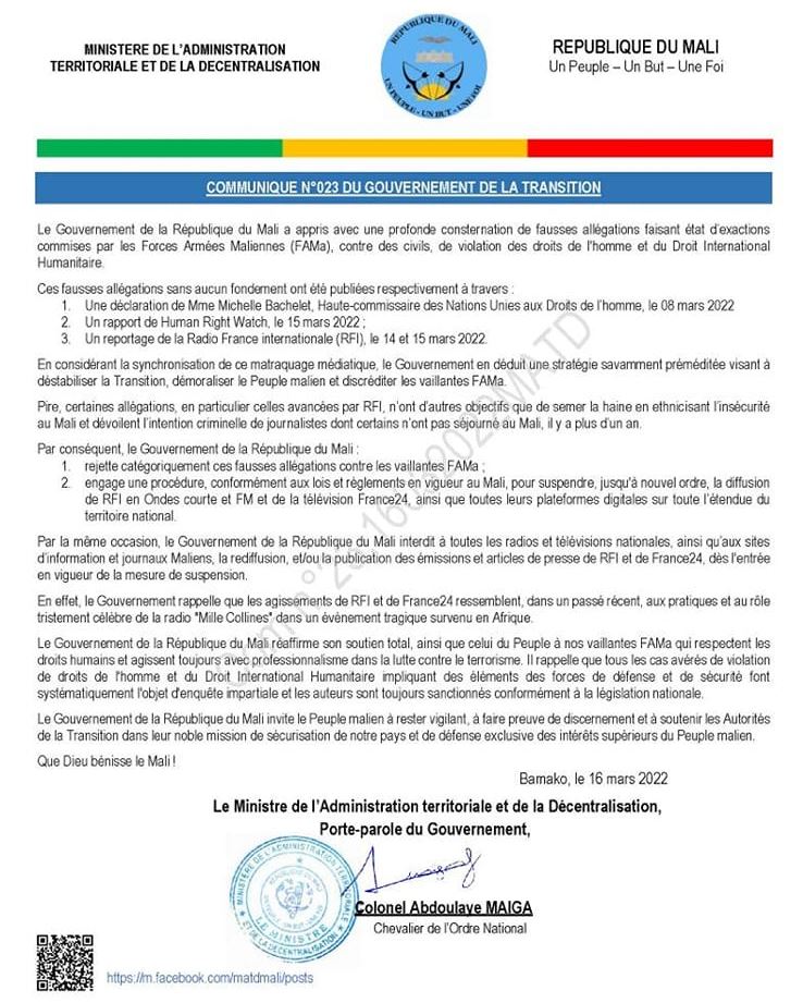 Le ministère de l’Administration territoriale du Mali a pondu un communiqué ce mardi afin d’annoncer la suspension des deux chaînes d’informations françaises, Rfi et France 24. Le gouvernement accuse ces médias français de manipulation et désinformation.