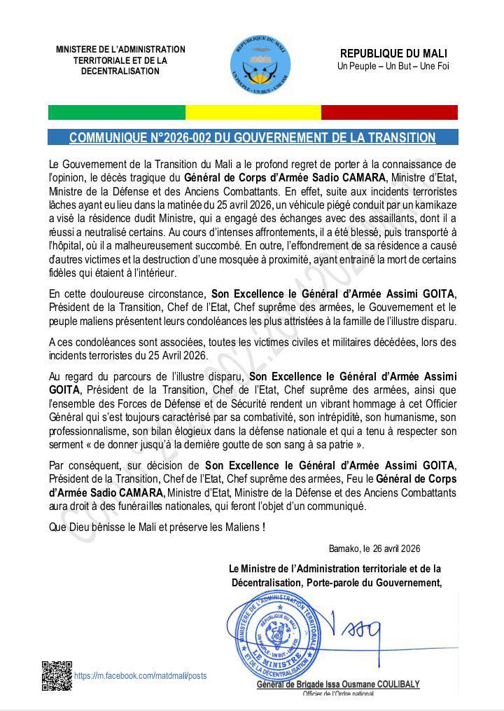 Le Gouvernement de la Transition du Mali a confirmé le décès tragique du Général de Corps d’Armée Sadio CAMARA, Ministre d’État, Ministre de la Défense et des Anciens Combattants. Le pays perd bien plus qu’un simple ministre : il perd un soldat engagé, un homme de devoir, une figure de la résistance nationale en des temps incertains, selon les témoignages.