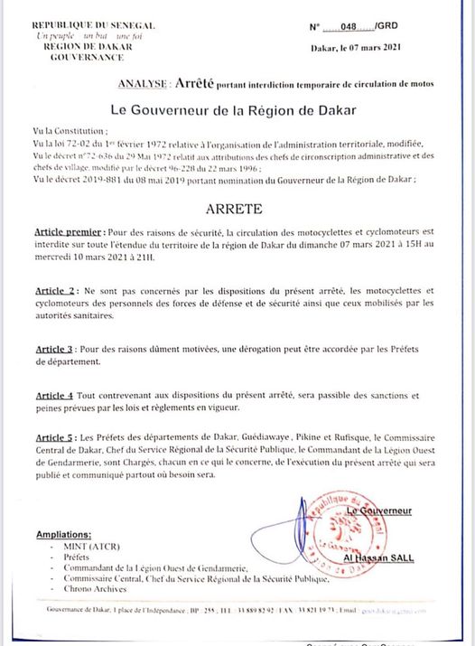 Pour des raisons de sécurité, la circulation des motocyclettes et cyclomoteurs est interdite sur toute l’étendue du territoire de la région de Dakar du dimanche 07 mars 2021 à 15h au mercredi 10 mars 2021 à 21h, rapporte un arrêté du Gouverneur de la région de Dakar.