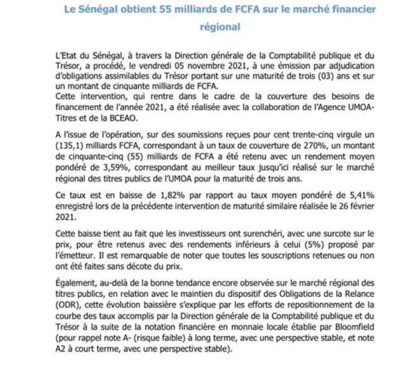 « Sur des soumissions reçues sur 135,1 milliards correspondent à un taux de couverture de 270%, un montant de 55 milliards de francs Cfa a été retenu avec un rendement moyen pondéré de 3,59%. Il s’agit là du meilleur taux jusqu’ici réalisé dur le marché régional des titres publics de l’Uemoa pour la maturité de 3 ans puisqu’étant en baisse de 1,82% par rapport su taux moyen pondéré de 5,41% enregistré lors de la précédente intervention réalisé le 26 février 2021« , soulignent les services du ministère des Finances repris par nos confrères.