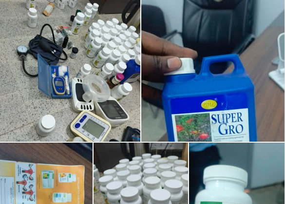 Cette opération fait suite à un renseignement opérationnel signalant la présence d’un groupe se livrant à des pratiques médicales illégales et à la commercialisation de produits de santé douteux sur la place du marché, utilisant notamment des tensiomètres et divers compléments alimentaires.