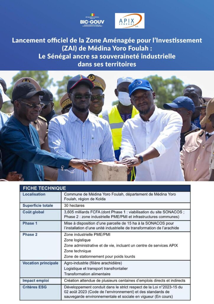 Le président Diomaye a profité de sa tournée à Kolda pour procéder, ce vendredi, au lancement du projet de la Zone d’Aménagement Industriel (ZAI) de Médina Yoro Foulah. Estimé à plus de trois milliards, ce pôle économique de 30 hectares vise à dynamiser la croissance locale en intégrant les entreprises sénégalaises dans le commerce mondial grâce à des infrastructures modernes et des incitations fiscales avantageuses.