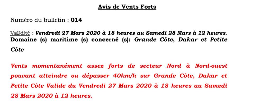 Selon le bulletin numéro 014, il y aura des « vents momentanément assez forts de secteur Nord à Nord-ouest pouvant atteindre ou dépasser 40km/h sur Grande Côte, Dakar et Petite Côte Valide du Vendredi 27 Mars 2020 à 18 heures au Samedi 28 Mars 2020 à 12 heures. »