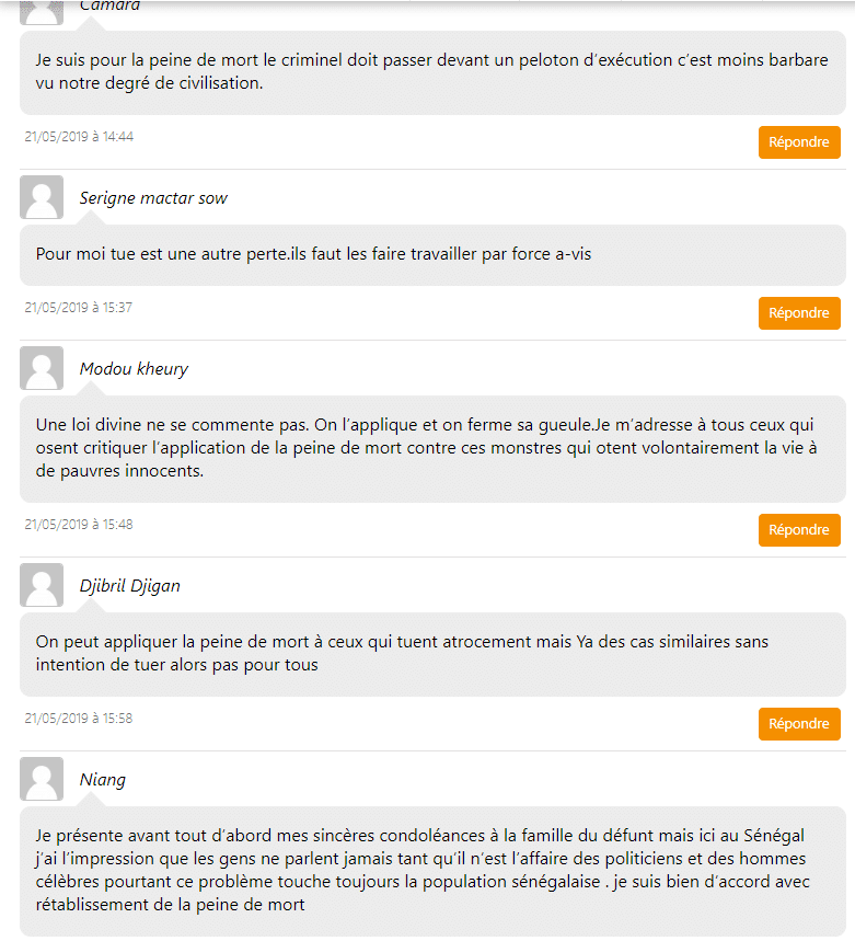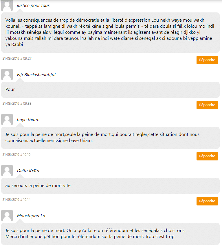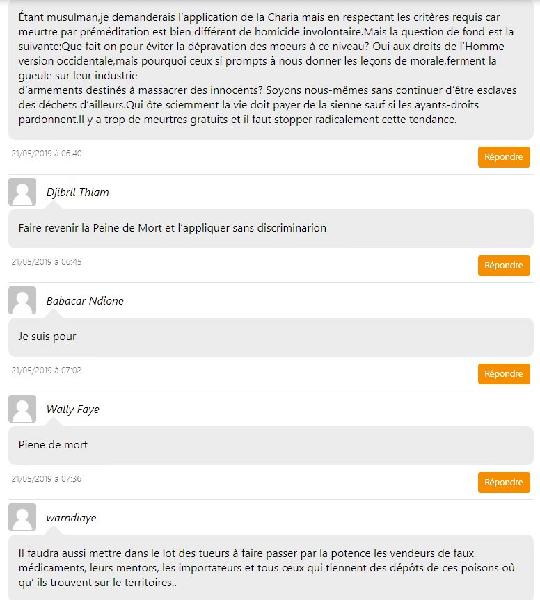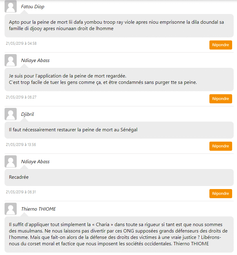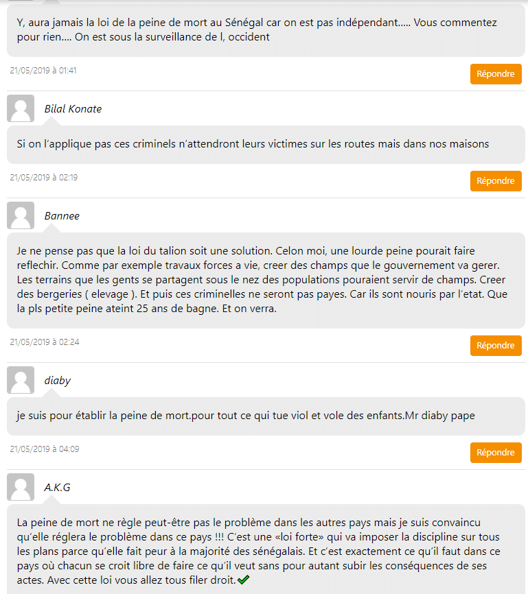 Pour ou contre la Peine de Mort ? le débat est ouvert aux internautes… C’est en ces termes que Senego s’étaient adressés à ses abonnés sollicitant leurs avis. Les commentaires laissent voir que les Sénégalais, majoritairement veulent l’application de la peine de mort.