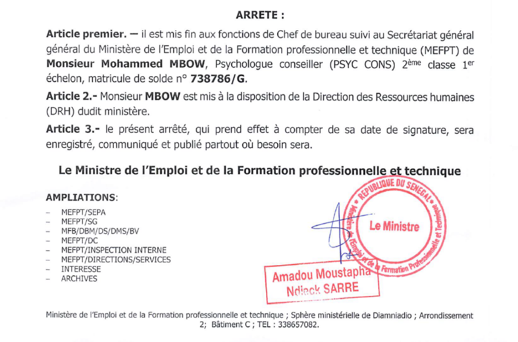 Mr Mbow arrêter la victimisation,lorsque vous aviez été nommé à ce poste sur décision du ministre vous n aviez pas produit un communiqué de presse pour en informer l opinion,pourquoi maintenant qu il vous démet vous voulez nous en informer…si les mêmes raisons qui vous ont nommé vous démette ça ne concerne que vous et le ministre..ce n est pas le problème des senegalais ça ne les concerne pas,dans l administration publique chaque jour on nomme et on démet, ne nous fatiguer pas avec la politique politicienne au quotidien