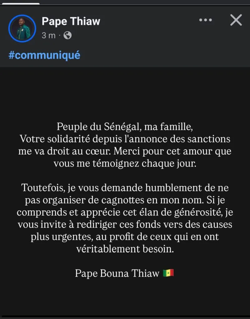 Au cœur d’un vaste élan de sympathie depuis l’annonce des mesures disciplinaires le concernant, le technicien sénégalais a tenu à s’adresser directement à l’opinion publique. Si l’ancien entraîneur par intérim des Lions se dit touché par les nombreuses marques d’affection reçues, il a profité de cette prise de parole relayée par Kawtef pour recadrer fermement les initiatives financières spontanées lancées en sa faveur.