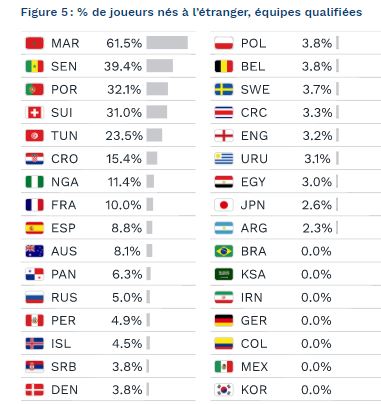 Avec 61,5% de joueurs nés à l’étranger, le royaume chérifien est même le seul des 32 pays qualifiés à ne pas avoir une base en majorité constituée de joueurs nés au pays. Le Sénégal (39,4%) fait lui aussi appel en masse aux binationaux, idem pour la Tunisie de façon moins importante (23,5%).