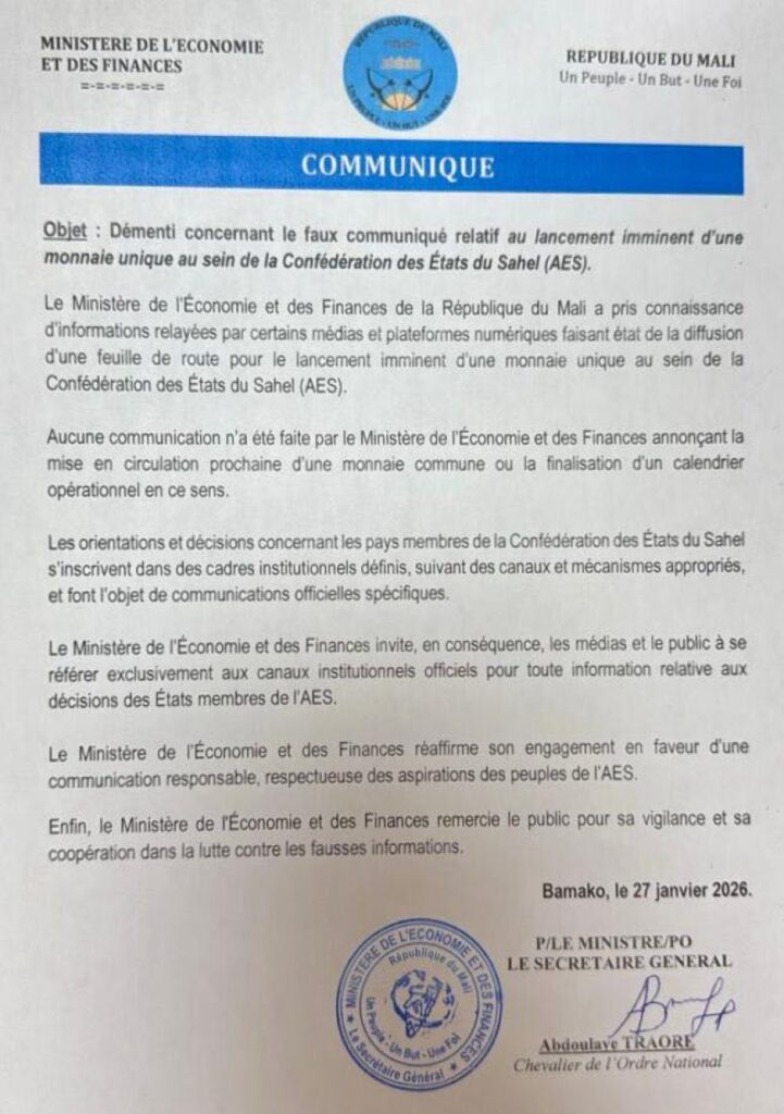 Le ministère de l’Économie et des Finances du Mali a formellement démenti, ce mardi 27 janvier 2026, les informations faisant état d’un lancement imminent d’une monnaie unique au sein de la Confédération des États du Sahel (AES).
