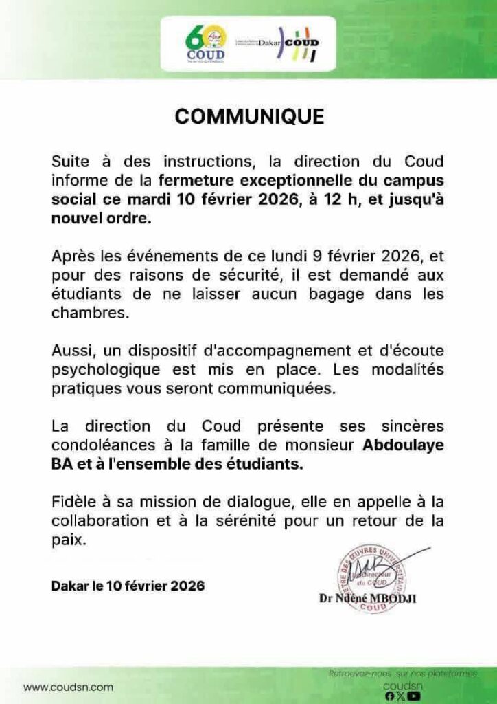 Le Centre des œuvres universitaires de Dakar (COUD) a annoncé la fermeture exceptionnelle du Campus social à la suite d’événements survenus le lundi 9 février 2026, ayant entraîné le décès de l’étudiant Abdoulaye Ba.