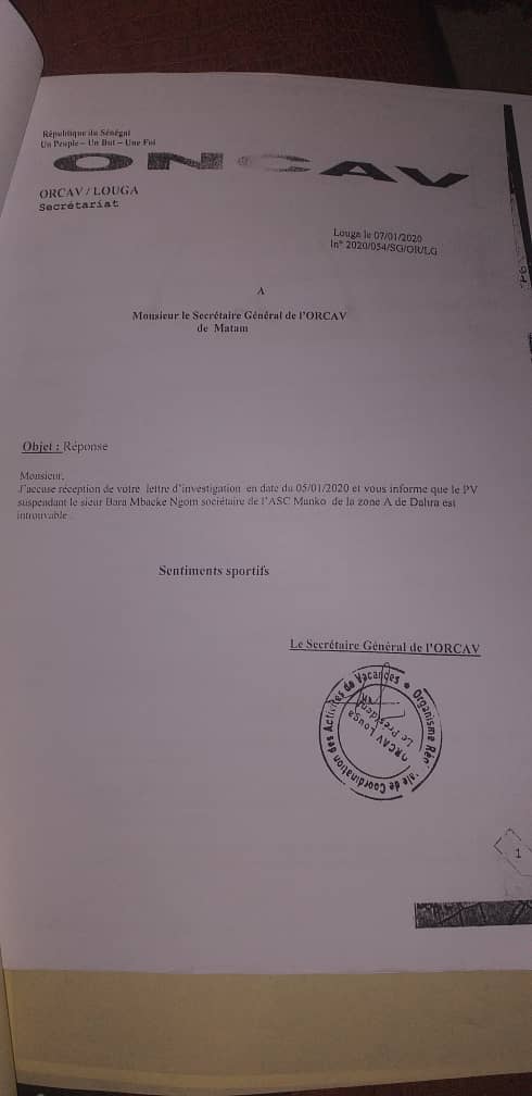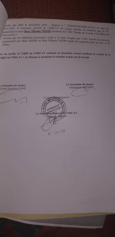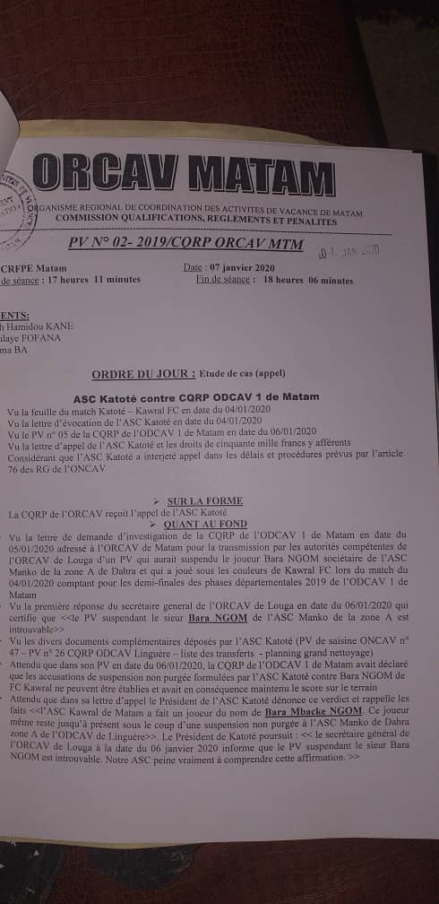 Après vérification, l’Odcav 1 de Matam a d’emblée débouté Katote parce que n’ayant aucune preuve de suspension d’un tel joueur. L’Orcav de Matam saisie également dans cette affaire a confirmé l’Odcav suite à des investigations à Louga et Dahara, disant qu’ils n’ont pas reçu de Pv suspendant le joueur.
