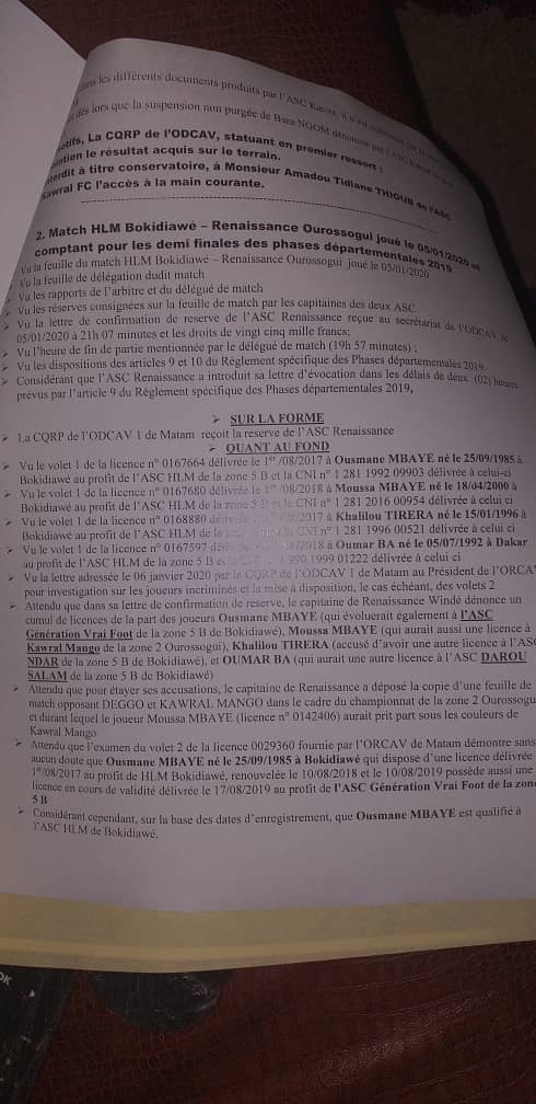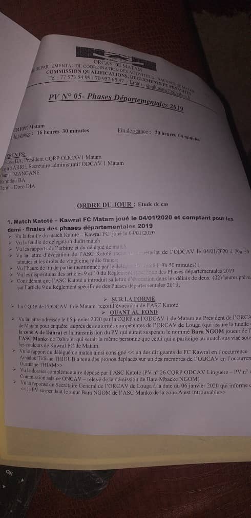 « Le même jour à 23h GMT (11 janvier), nous avons reçu un Pv de l’Odcav nous indiquant que nous avons perdu le match (demi-finale contre Katote) parce que les dirigeants à Louga auraient déclaré que le joueur était suspendu sans Pv. Ce que nous estimons scandaleux depuis quand on sanctionne sans preuve matérielle », a dénoncé Me Kalidou Barry, membre et dirigeant de Fc Kawral Matam.
