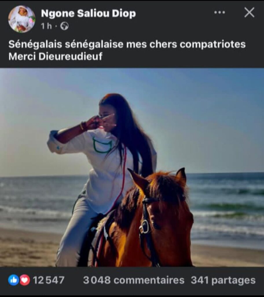 Sur sa page Facebook, quelques heures après sa sortie, Ngoné Saliou Diop a publié une photo d’elle à cheval sur une plage, accompagnée du message :