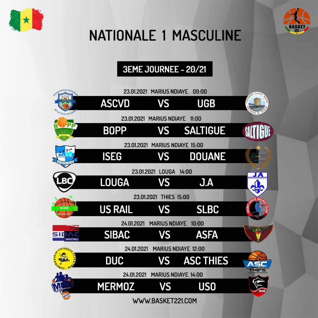Début de la 3ème journée de la Nationale 1 masculine ce samedi 23 janvier avec quatre formations qui tenteront de se relancer après leurs premiers revers. Il s’agit de Bopp, Ville de Dakar, Louga BC et et ISEG. Ces quatre équipes qui avaient réussi à gagner leurs premiers matchs se sont par la suite inclinées dans la deuxième journée. Elles seront respectivement opposées à Saltigué, UGB, Jeanne d’Arc et Douane.