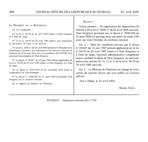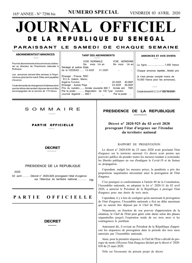 L’article 4 de la loi d’habilitation n°2020-13 promulgué le 02 avril 2020, a autorisé « la prorogation de l’état d’urgence pour une période de 3 mois, à compter de la publication de ladite loi ». Toutefois, l’alinéa 2 de l’article 4 de la loi d’habilitation précise qu’il peut être mis fin à l’état d’urgence par décret avant l’expiration du délai fixé par la loi prorogeant l’état d’urgence ». C’est en vertu de cet alinéa, que Macky Sall a pris le décret n°2020-925 du 03 avril, prorogeant l’état d’urgence pour une durée d’un mois, à compter du 03 avril 2020, date à laquelle le décret a été publié au journal officiel n°7296 bis. Une lecture attentive du rapport de présentation relatif au décret n°2020-925 du 03 avril 2020, permet de déceler une énorme faille permettant de prouver de manière claire et nette que l’état d’urgence prendra fin exactement dans 1 mois, soit le 03 mai 2020, sans aucune possibilité de prorogation.
