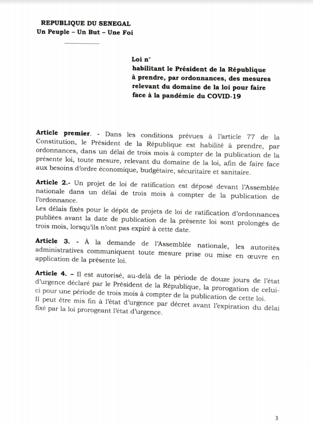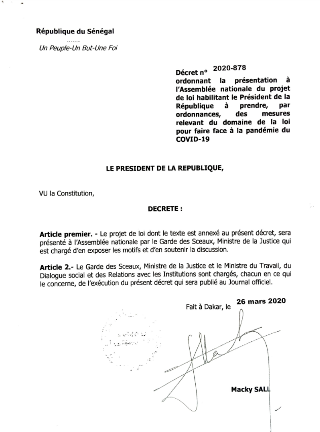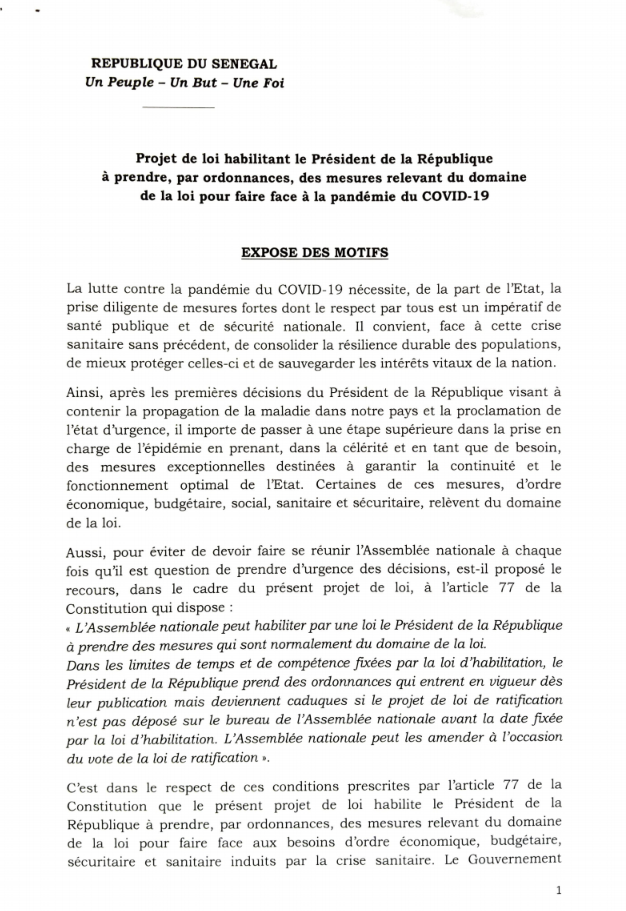 Il suffit de lire l’exposé des motifs du projet de loi d’habilitation du 26 mars 2020 qui ne prévoit aucun séquencement, pour constater que le rapport de présentation du décret n°2020-925 qui prévoit un séquencement est un grossier FAUX (primo, il y a une incohérence entre le contenu de l’exposé des motifs du projet de loi d’habilitation et celui du rapport de présentation du décret 2020-925 , et secundo, Macky Sall doit appliquer la loi et non l’inventer en s’arrogeant un pouvoir d’appréciation qui n’est prévu par aucun texte).