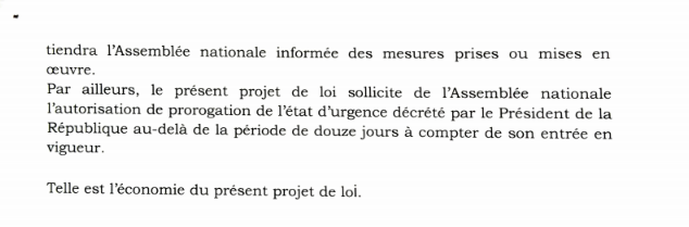 L’alinéa 2 de l’article 69 de la Constitution dispose que « Le décret proclamant l’état de siège ou l’état d’urgence cesse d’être en vigueur après douze jours, à moins que l’Assemblée nationale, saisie par le Président de la République, n’en ait autorisé la prorogation ».