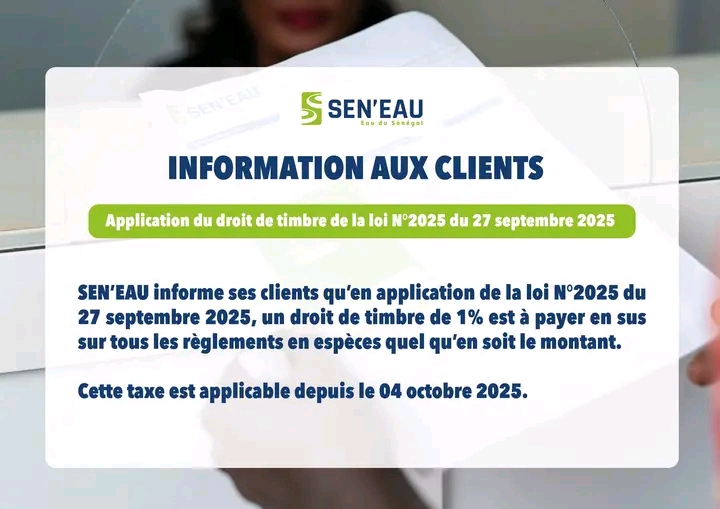 SEN’EAU informe sa clientèle qu’un nouveau dispositif fiscal entre en vigueur depuis le 4 octobre 2025. Conformément à la loi N°2025 du 27 septembre 2025, tous les paiements effectués en espèces seront désormais soumis à un droit de timbre de 1 %, quel que soit le montant.