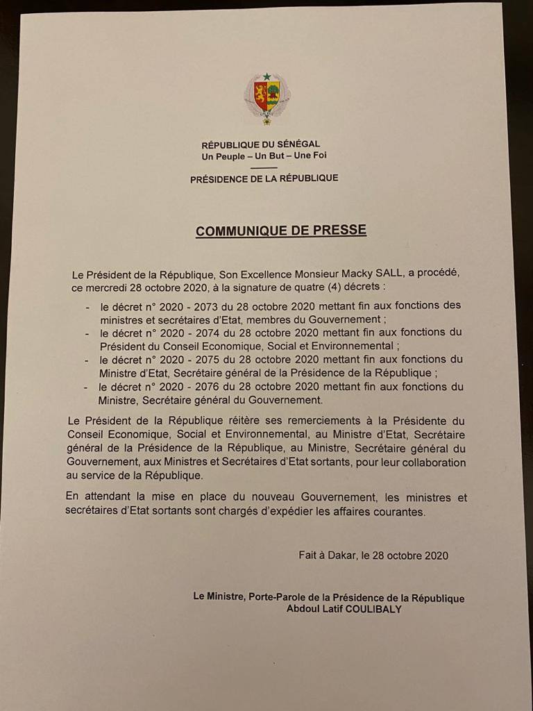 Le président de la République Macky Sall acte la démission du gouvernement ce mercredi 28 octobre 2020.