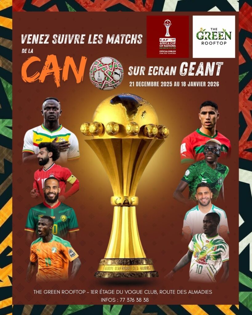 The Green Rooftop (Almadies) : diffusion annoncée de la CAN sur écran géant sur toute la période. Si vous voulez un spot “rooftop festif” pour ne pas rater les matchs des Lions, c’est une option très citée.