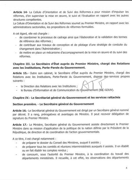 Le décret abroge et remplace les textes de 2014 et 2019 relatifs à l’organisation et aux attributions du Secrétaire général du Gouvernement. Il s’articule désormais en quatre chapitres : dispositions générales, Cabinet du Premier Ministre, Secrétaire d’État chargé des Relations avec les Institutions, et Secrétariat général du Gouvernement avec ses services rattachés.