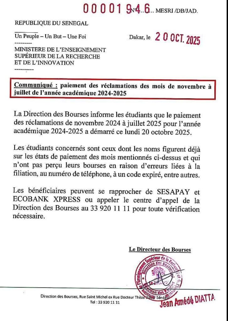 La direction des bourses informe les étudiants que le paiement des réclamations des mois de novembre à juillet de l’année académique 2024-2025 est en cours. Elle précise également que les bénéficiaires peuvent se rapprocher d’Ecobank et CIE pour effectuer les opérations. Une bonne nouvelle pour les étudiants concernés.