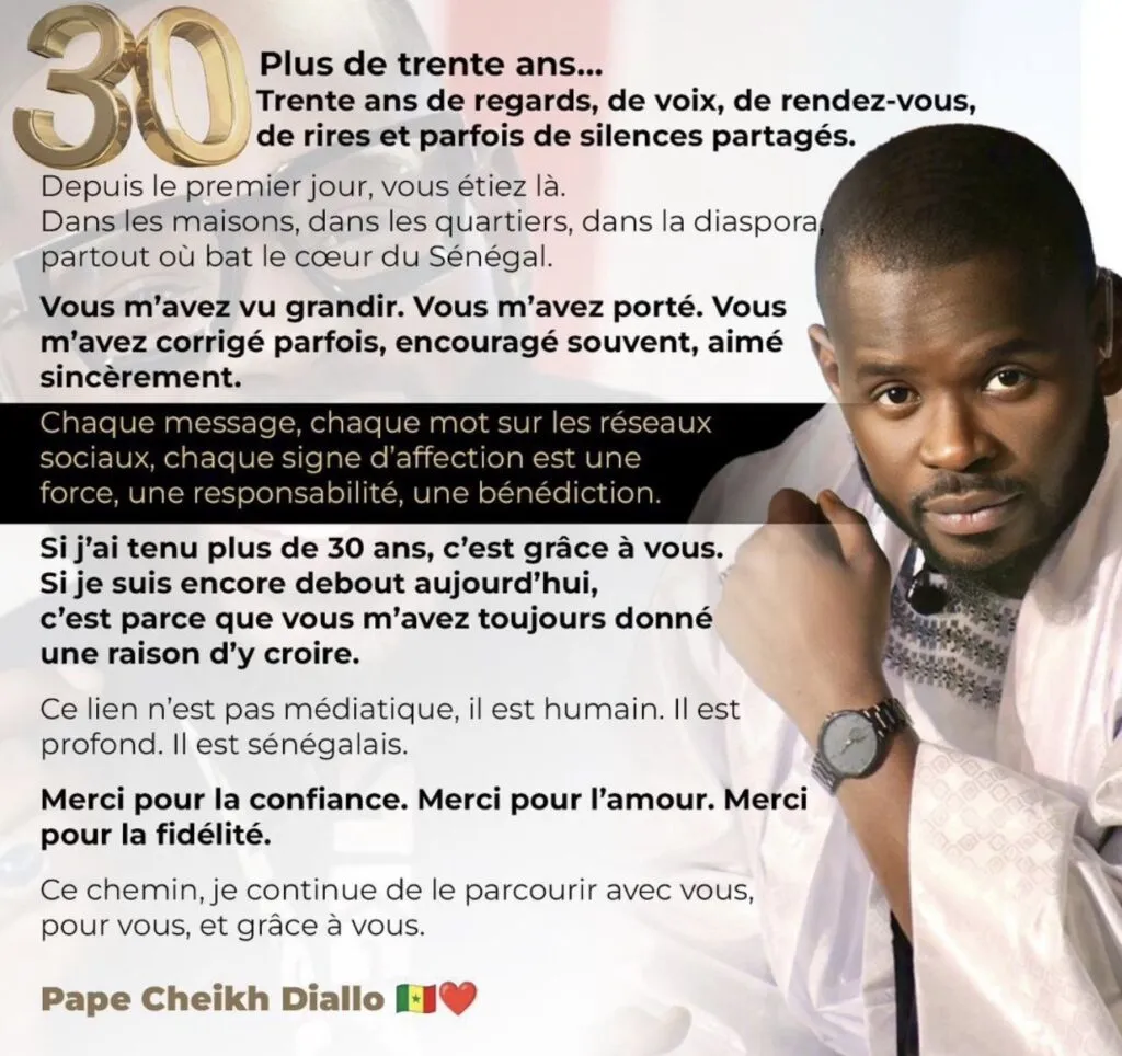 L’animateur vedette Pape Cheikh Diallo a tenu à marquer ses trente années de présence dans le paysage médiatique sénégalais à travers une sortie empreinte de reconnaissance. Il s’est adressé directement au public pour exprimer sa gratitude envers ceux qui ont suivi son évolution professionnelle.