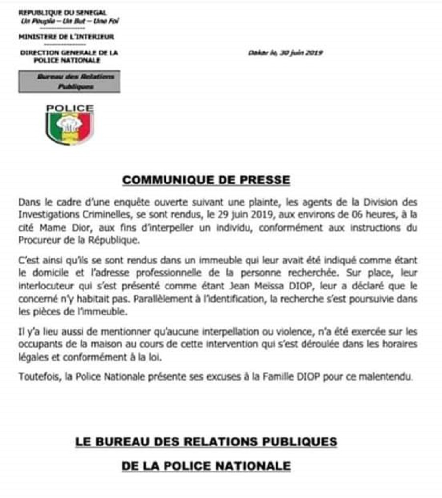 Et à travers un communiqué, les limiers ont tenu à s’expliquer et à s’excuser auprès de Jean Meïssa Diop qui, nous dit-on a porté plainte contre X.