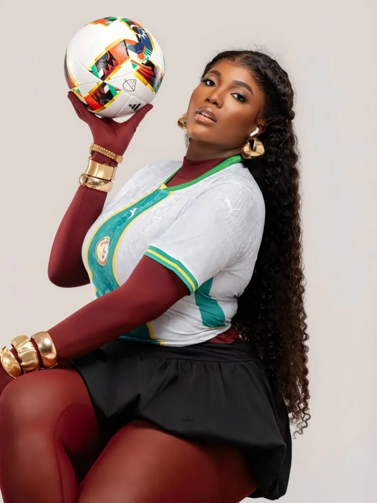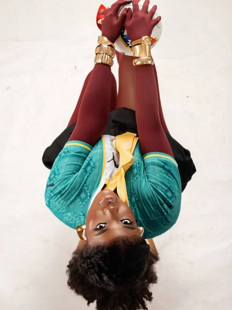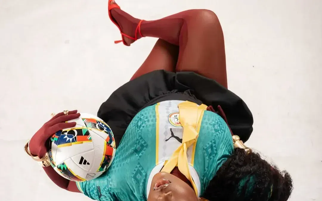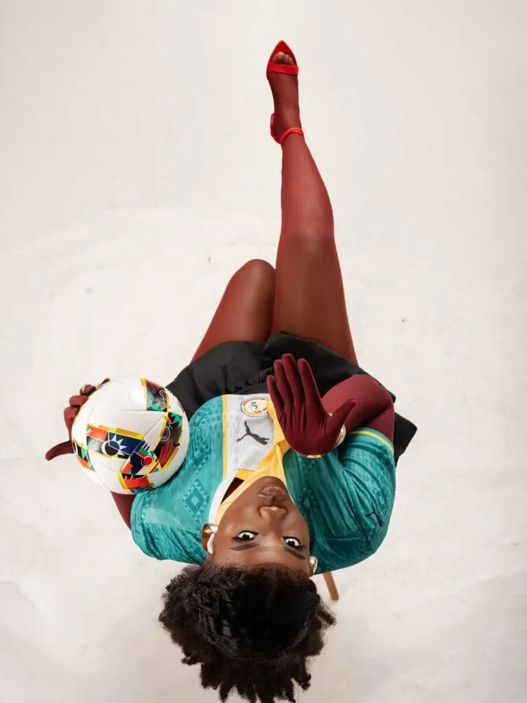 Sur ces images, la jeune femme adopte une posture originale, allongée avec un ballon de football en main, symbole de son attachement à la sélection. Le contraste visuel est marqué par l’association du vert du maillot, des accessoires rouges et d’un fond clair, offrant un rendu moderne. Selon la description fournie par Kawtef, « son regard assuré et sa mise en scène créative traduisent une confiance naturelle et une volonté de casser les codes », positionnant cette démarche comme une célébration de la femme africaine contemporaine.
