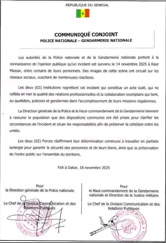 Un incident survenu le 14 novembre 2025 à Keur Massar entre des éléments de la Police nationale et de la Gendarmerie nationale a enflammé les réseaux sociaux, après la diffusion de vidéos largement commentées. Face aux réactions, les deux institutions ont publié un communiqué conjoint pour apaiser les tensions et éclairer l’opinion.