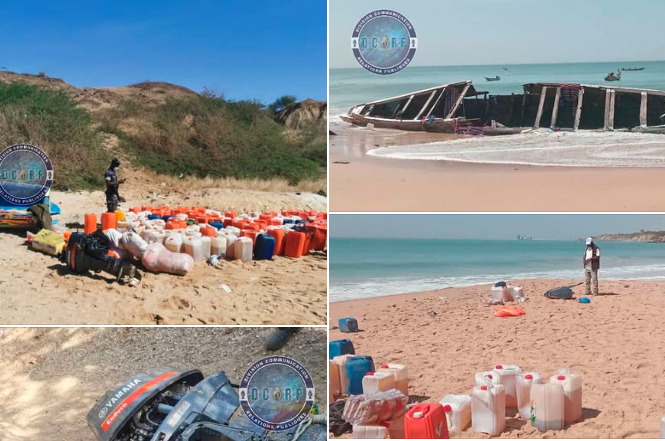 Le matériel saisi comprend « une pirogue de 25 mètres de long endommagée, deux moteurs hors-bord, 149 bidons d’essence représentant 3 270 litres de carburant, ainsi qu’un groupe électrogène ».